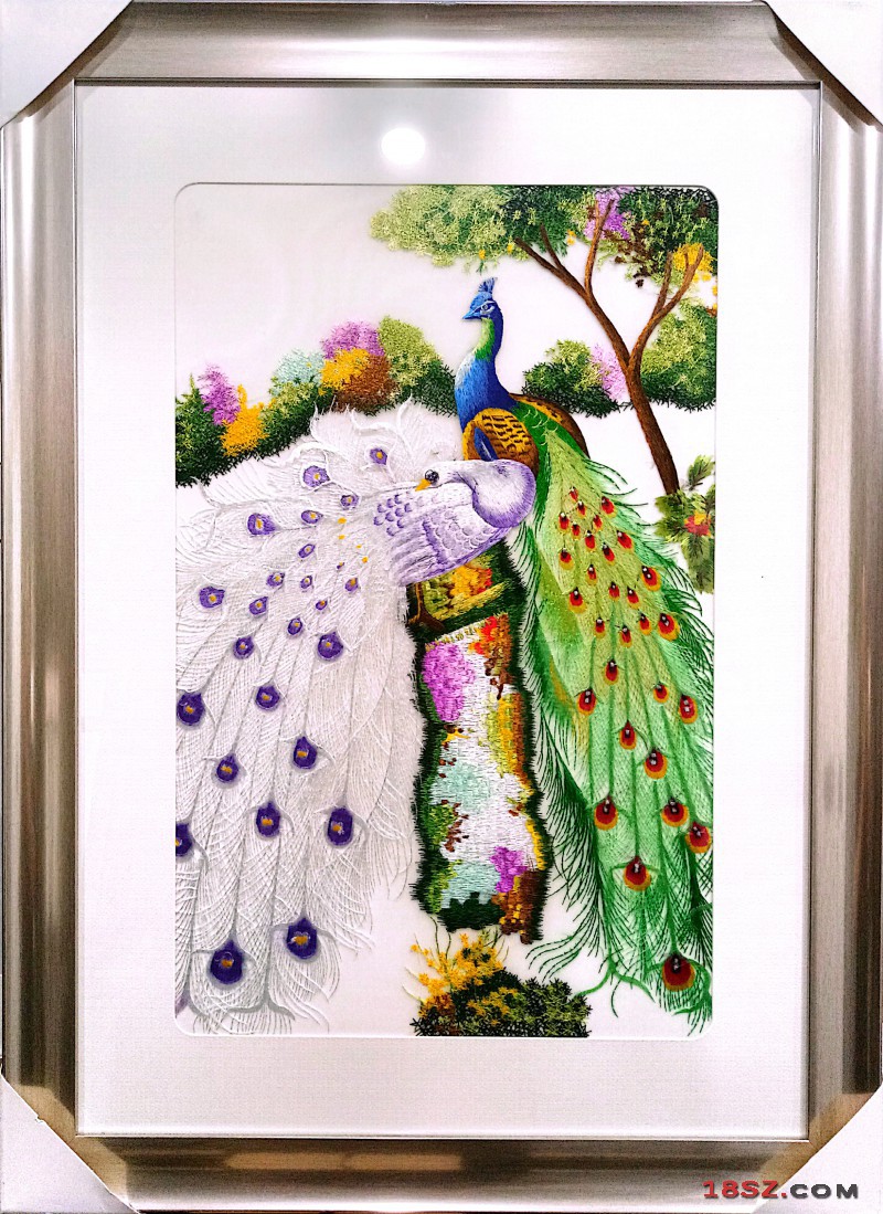 作品名称:孔雀;适合场所:卧室、客厅、走廊、玄关、会议室、办公室等;作品寓意:吉祥如意、白头偕老和前程似锦。